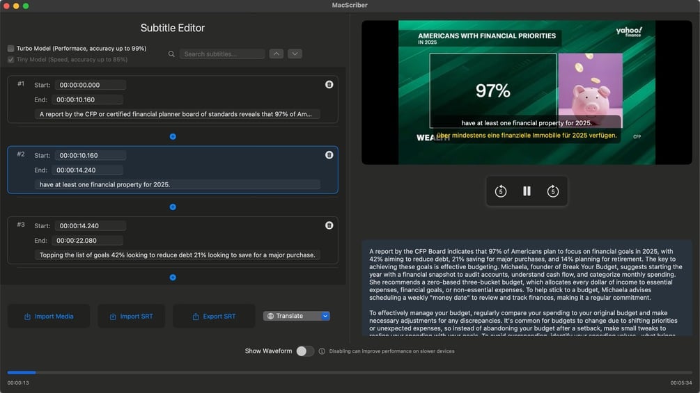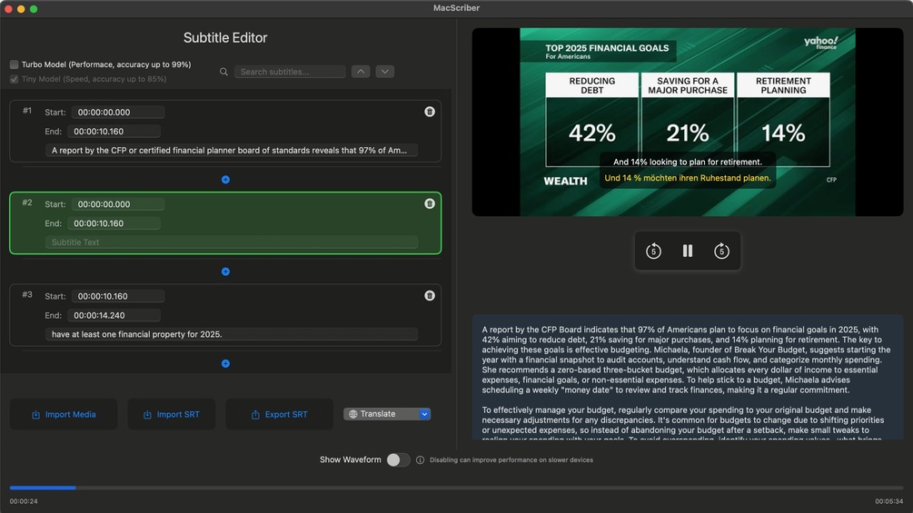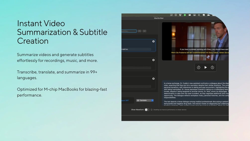 MacScriber is a powerful AI-enabled video summarization and subtitle creation tool optimized for M-chip MacBooks.