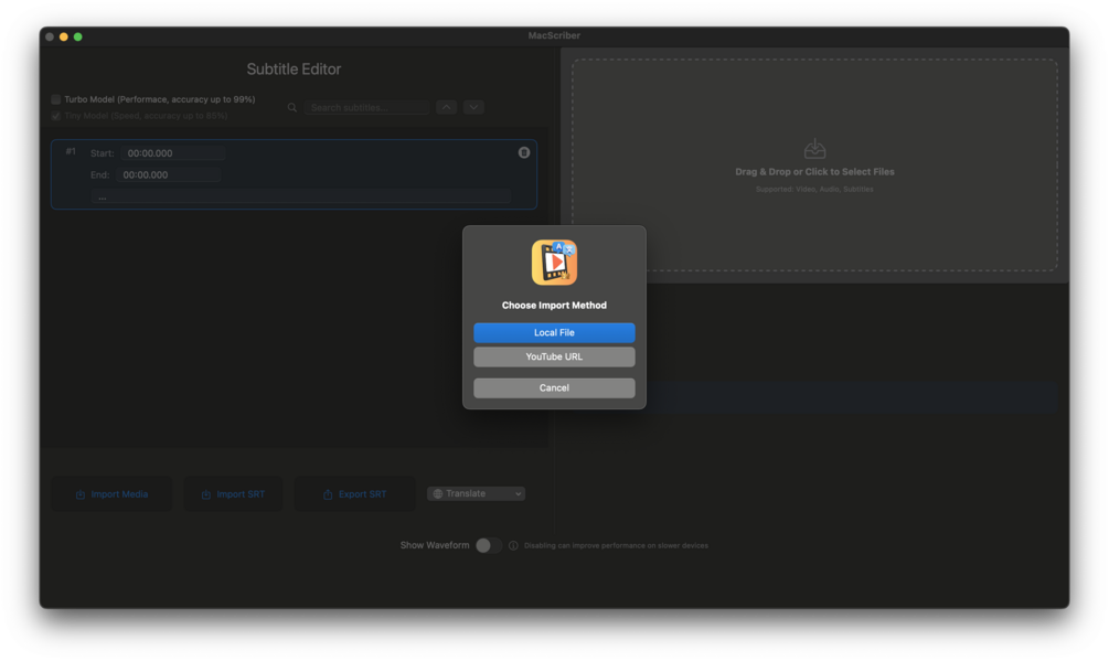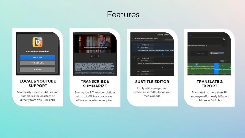 - Local file and YouTube video support for seamless subtitle processing